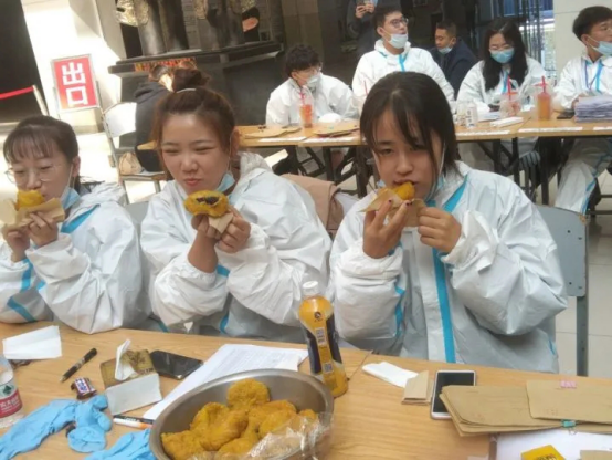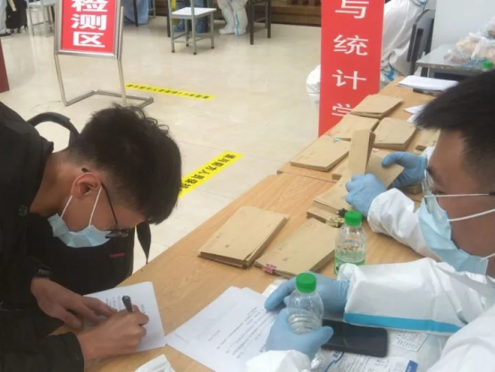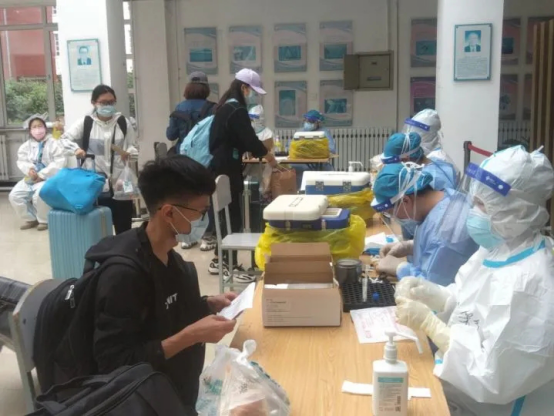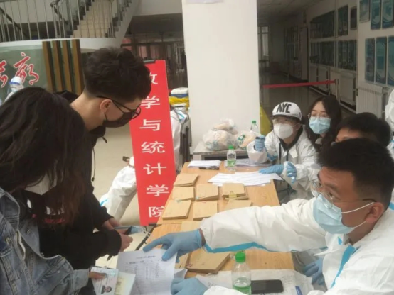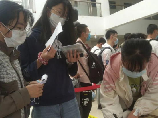 学子们通过志愿者的引导,从一号门进行体温检测后进入校园,首先到一教阳光大厅报道,更换下崭新的更加安全的口罩并上交体温监测表,工作人员将核酸检测条形码从密封的文档中拆开分发给学子,老师和工作人员们耐心的指引着学子们井然有序的进行核酸检测。完成检测的同学们在工作人员的帮助下带着入住公寓证明返回已经严格消毒的寝室进行隔离,等待核酸检测结果,并且为等待检测结果的学子们准备了营养均衡的餐包。